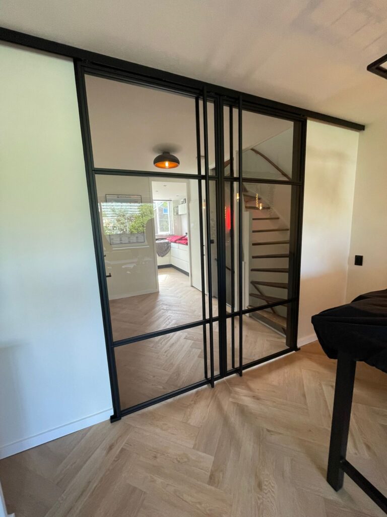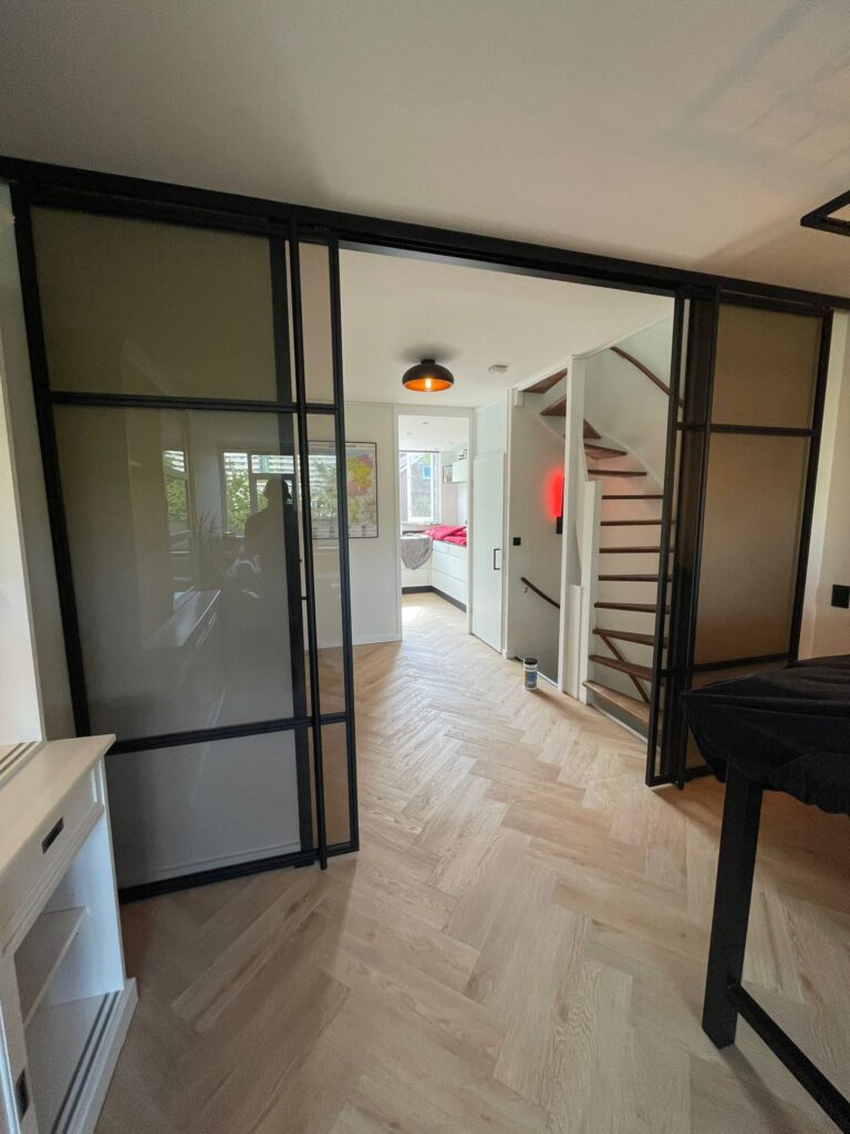 Onlangs hebben wij in Zoetermeer een prachtig project afgerond: het ontwerpen, maken en plaatsen van een dubbele schuifdeur op maat op de eerste etage van een woning.