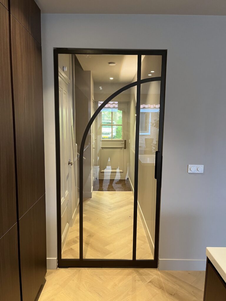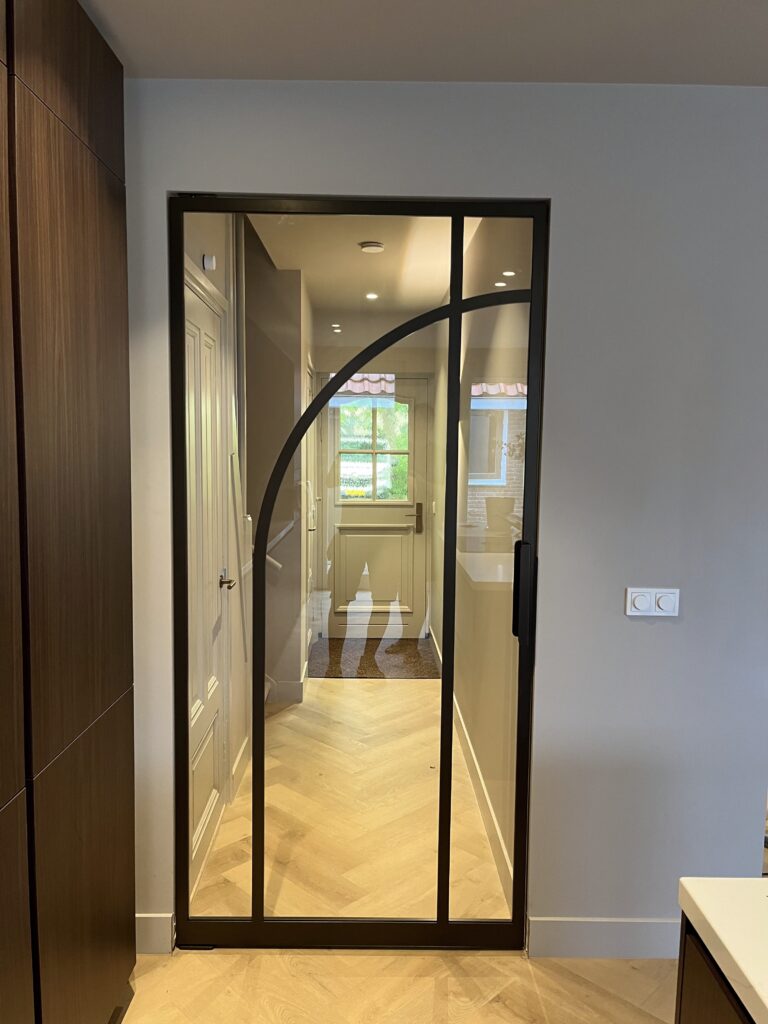 Voor een klant in Loenen aan de Vecht hebben wij een unieke enkele taatsdeur met boog in de glasverdeling op maat gemaakt en geplaatst. Deze maatwerk deur verbindt stijlvol de keuken met de rest van de woning en sluit perfect aan bij het interieur.